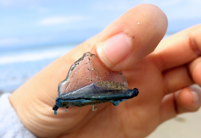 In any case, it’s usually more important to know whether something can sting you rather than what, exactly, it’s called. Velella velella don’t have stingers that normally harm humans. But it’s better to be careful when handling any jellyfish-like creature in case the stinging cells cause an unexpected allergic reaction. These thoughts cross my mind as I’m setting the little hydrozoan down and rubbing my tingling fingertips on my beach towel.
