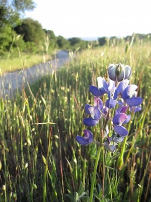 Starting up Engelsmans Loop (we went to the left first), you’ve got your blue-eyed grass here and there and approximately one bazillion sky lupines. These are just stunning. Here at Wilder Ranch they’re mostly tri-colored, with a few pink petals among the usual deep purple (or is it blue? Discuss.) and white. They’re especially profuse below the new bypass route, on the western branch of the loop, and about halfway down the eastern branch. Look for ceanothus, yet another purple/blue blossom, in the same neighborhood as the irises, at the top of the loop. (Photo of sky lupine by Hilltromper)