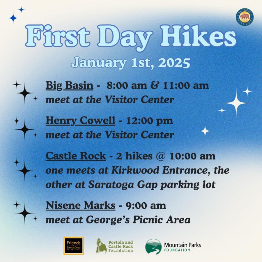 California State Parks wants you to kick off 2025 in a healthy way and enjoy the fresh air with the annual First Day Hikes. There are many hikes taking place in Santa Cruz County state parks, including Big Basin Redwoods, Henry Cowell Redwoods, Castle Rock, Nisene Markes, and Wilder Ranch.
