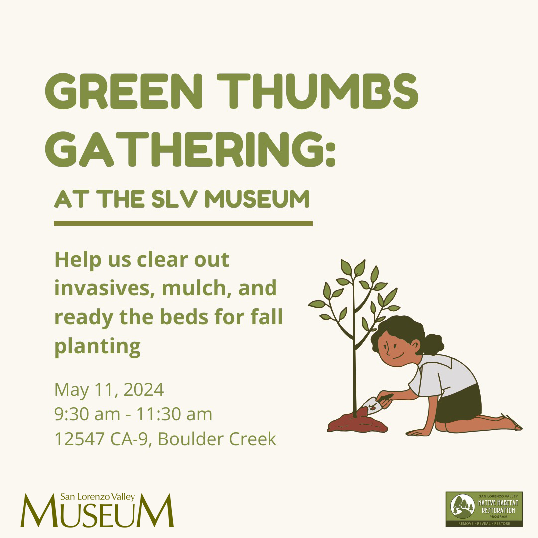 Join San Lorenzo Valley Museum in their partnership with the SLV Native Habitat Restoration Project of the Valley Women's Club to prepare the plant beds at the Grace Gallery in Boulder Creek for native plantings in the fall. We will be ridding the beds on non-native invasive plants and mulching. Help us identify native plants we already have on the premises. Bring your own gloves & water.