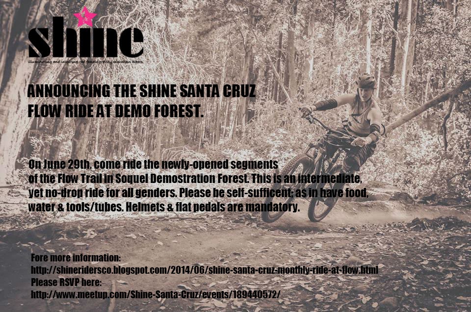 Shine Riders of Santa Cruz make tracks for the Demo Flow Trail, which has two complete sections. Only this time men are allowed on the ride—if they accompany a woman. That's right, boys—some mountain biking gal is your ticket to this day of low-pressure fun led by former pro downhiller and enthusiasmatron Joh Rathbun. RSVP here to get details on where to meet.