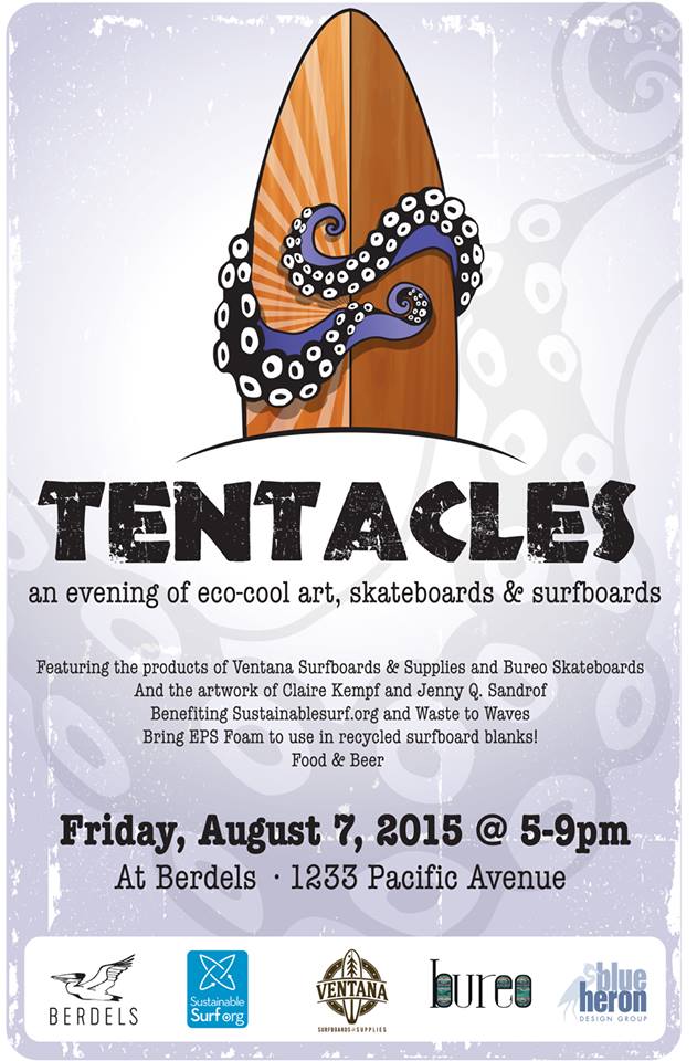Berdels is hosting Tentacles: An Evening of Eco-Cool Art, Surfboards & Skateboards on Friday, August 7th. This even will feature products from Ventana Surfboards and Bureo Skateboards. Mother and daughter team Jenny Q. Sandrof and Claire Kempf will be displaying their unique art. There will be food and beer served and best of all it benefits Sustainable Surf and their Waste to Waves program. The event is free, but don't forget to bring EPS Foam to be used in recycled surfboard blanks.